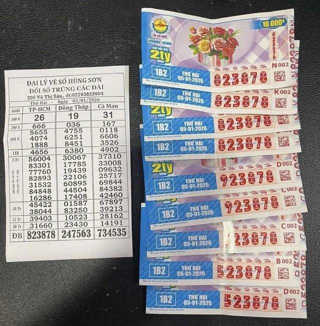 Đại lý bán vé số lâu năm Hùng Sơn ở Tây Ninh đã tiến hành trao thưởng giải độc đắc xổ số miền Nam với giá trị 8 tỷ 250 triệu đồng (chưa trừ thuế) cho khách hàng may mắn tại đây. Được biết, trong đó có 4 vé trúng độc đắc dãy số 823878 (8 tỷ) và 5 vé an ủi dãy số 523878 và 923878 (250 triệu) cùng thuộc đài TP.HCM mở thưởng XSMN thứ 2 ngày 5 tháng 1 năm 2026.